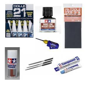 Nous proposons toute la gamme Top Studio (rivets, boulons, câblage, connecteurs, décalcomanies), des colles professionnelles (cyanoacrylate, colle plastique liquide), du papier abrasif de précision, des cutter de modélisme, du mastic, des flocages, des peintures spécialisées pour carrosseries miniatures (vernis brillant, finitions satinées, effets métallisés…), et bien plus encore.